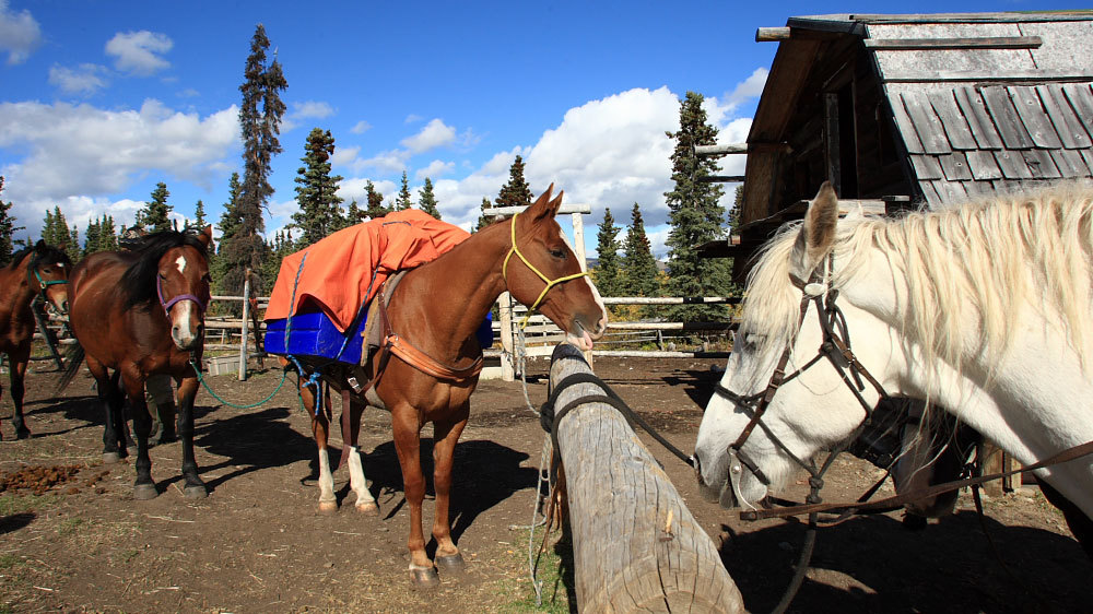 Dag 8Rose Lake – Big Ben We breken ons kamp op en rijden door het bos, richting de weilanden. Na de middag houden we een siësta, terwijl de paarden in de buurt grazen. We laten de alpenweiden dan achter ons en volgen de Watson-rivier tot diep in het bos. Misschien zien we wel grizzlies en beverdammen. We eten en slapen vannacht in een traditionele trappershut. Pierre geeft meer uitleg bij de het leven van de trappers in de Yukon. (ongeveer 5-6 uur in het zadel)