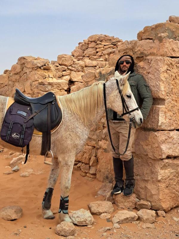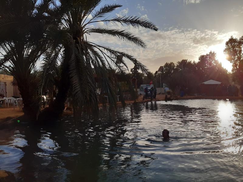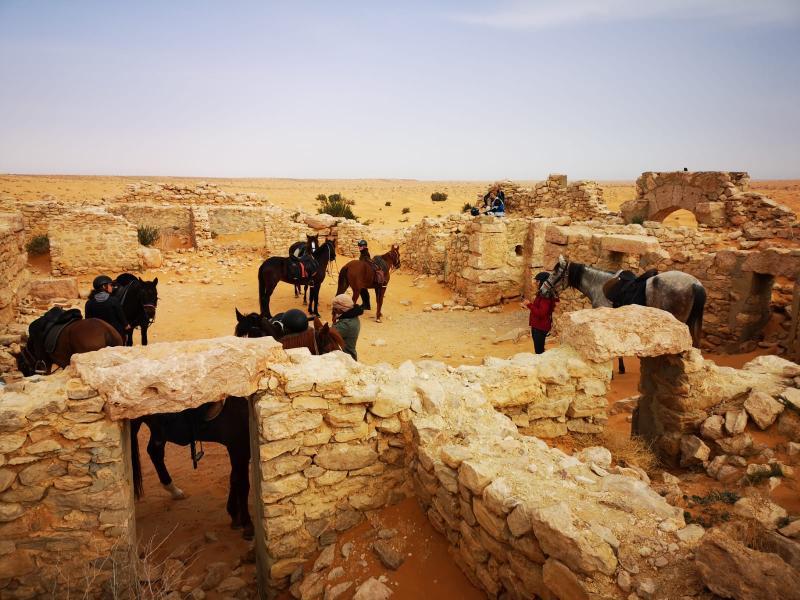 Dag 6Na het ontbijt stijgen we op en rijden weg om een oud Frans fort te bezoeken. Het imposante bouwwerk ligt hoog op Romeinse ruïnes en biedt fantastisch zicht over de immense woestijn. Na het bezoek aan deze spectaculaire plek rijden we terug naar ons kamp voor de lunch. Na de pauze gaan we ’s middags verder op avontuur. We rijden dieper de woestijn in en bereiken uiteindelijk ons unieke kampement Ain Skhouna waar we overnachten. Hier, in het hart van de woestijn, zal je verborgen warmtebronnen ontdekken waar je kunt ontspannen en waarin je kunt zwemmen. Heerlijk na ongeveer zes uur te paard te hebben gezeten. Daarna wacht een zalig diner. Overnachting in het fijne kampement onder de sterren.