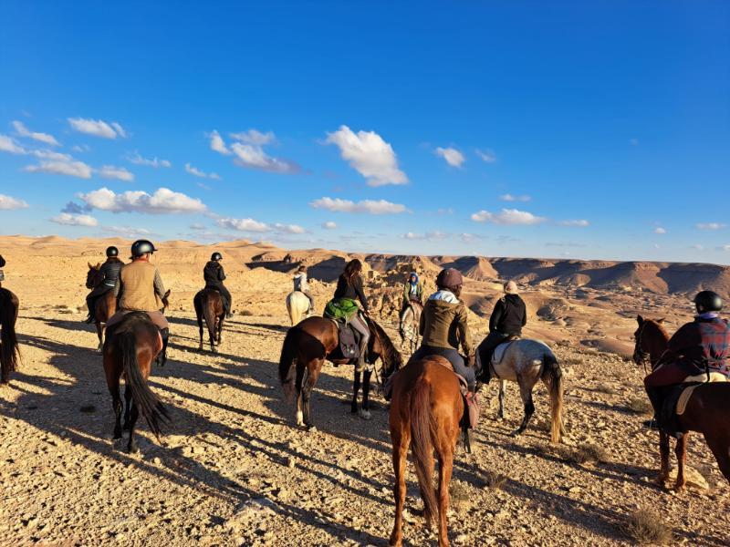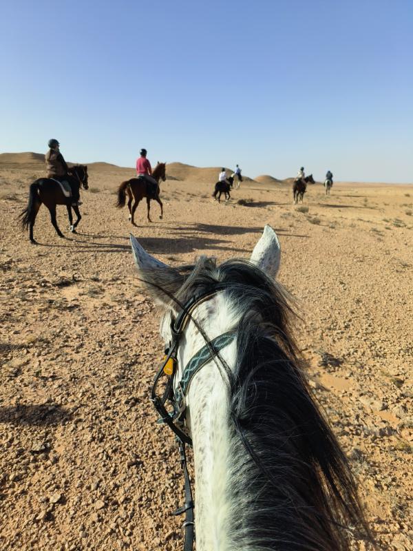 De trektocht begint in de bergen en eindigt langs enorme zandduinen. Onderweg rijd je in verschillende snelheden. Als het terrein het toestaat, zijn er mogelijkheden om te draven en uitgebreid te galopperen.
