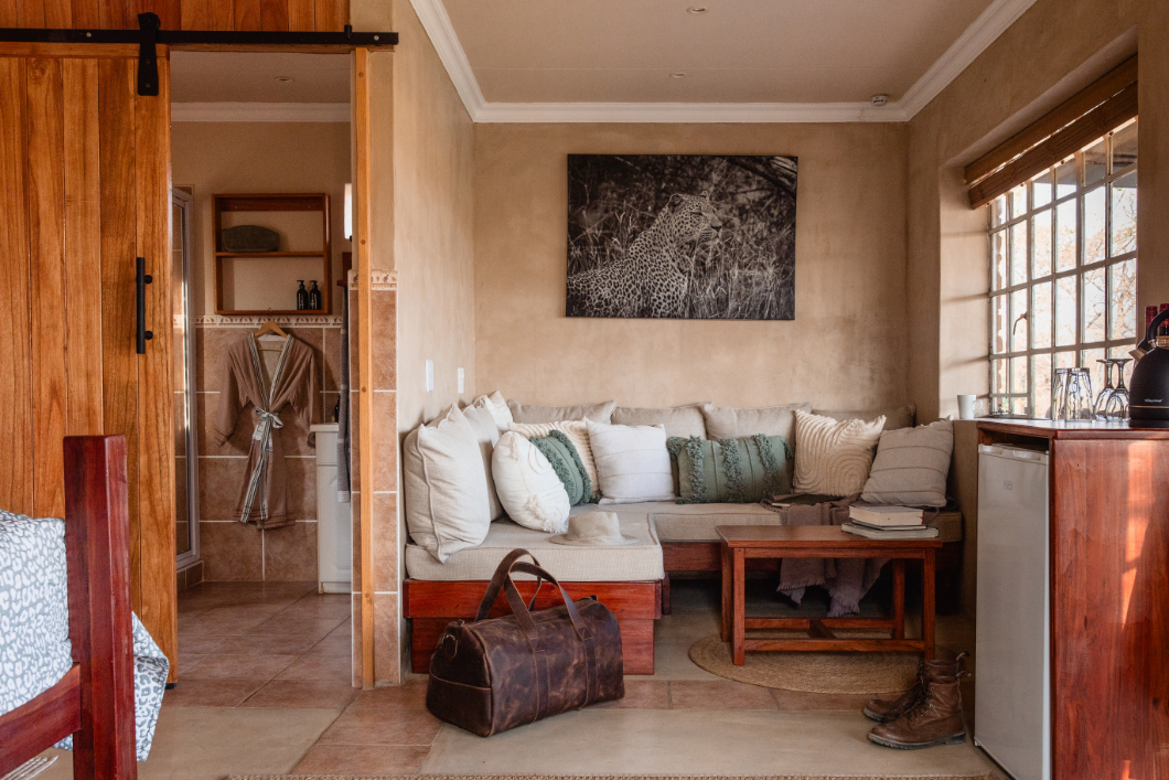 Je verblijft in een van de sfeervolle lodges in Bushwillow Camp, die perfect opgaan in de omgeving en alle moderne gemakken bieden. De stijlvolle inrichting en comfortabele bedden zorgen voor een aangenaam verblijf. De lodges zitten op een korte loopafstand van de hoofdlodge, waar je kan afkoelen in het zwembad na een dag in het zadel. Vanaf de lodge heb je een adembenemend uitzicht over de savanne, waar je onder het genot van een drankje kunt genieten van de ondergaande zon en de geluiden van de Afrikaanse natuur.